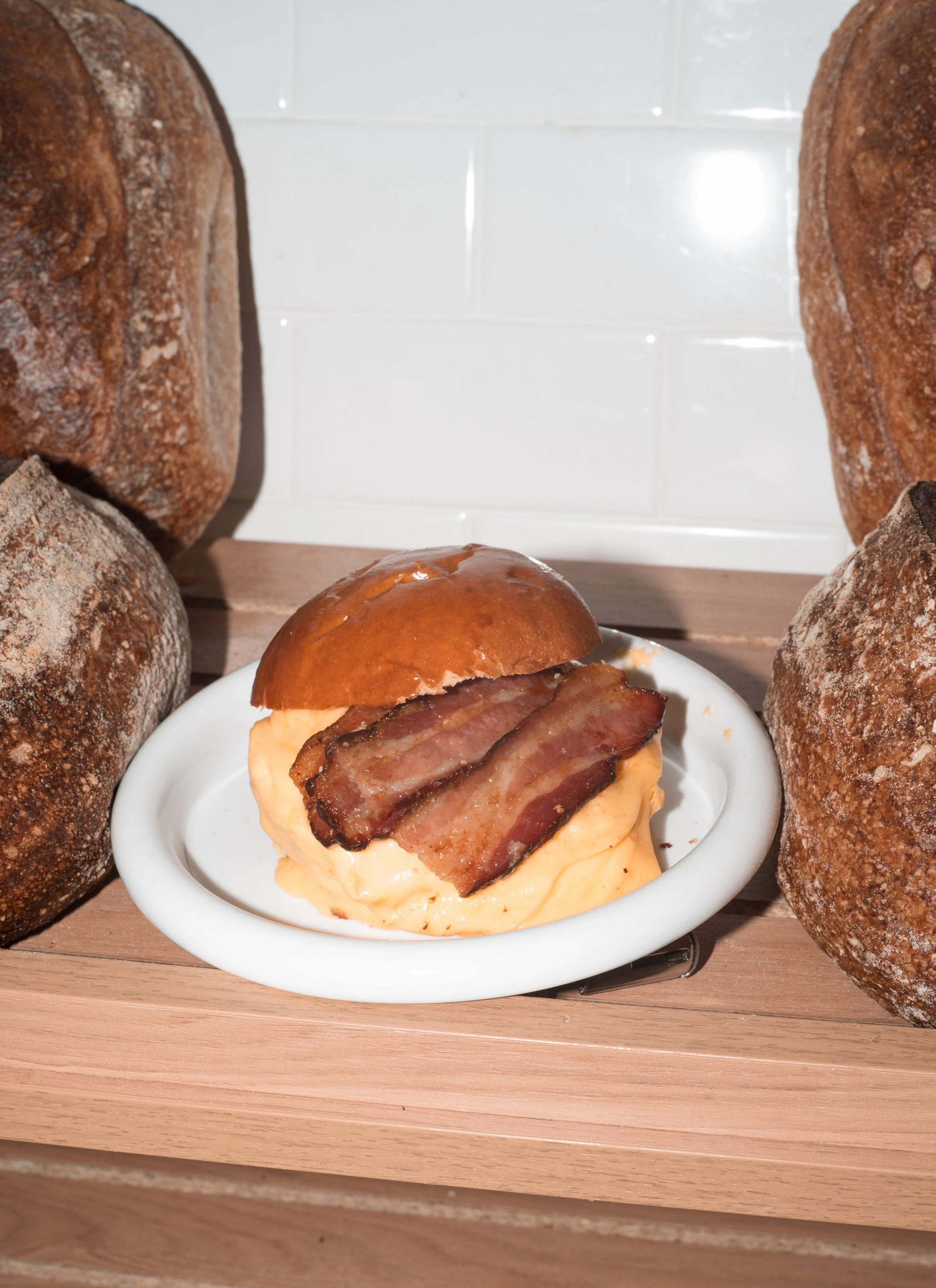 Sweet Potato Bun, Soft Scrambled Eggs, Thick-Cut Bacon and American Cheese